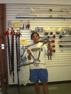 Troy holds up the frame of the bike he totaled. The bike was out of commission but Troy was fine. The repair shop already had the bike stripped by the time we got the camera out!