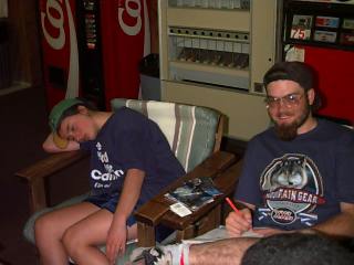 We woke up and left the campground by the river and stopped in Cody, WY to do laundry. When we finished we drove farther into town and stopped for a lunch break. We stopped at Taco Johns and then Cheryl and I went for a walk. We stopped in a small art shop and then went to the park where everyone was either lying around, playing on swings, playing hackey or throwing a frisbee. Then we left and rode to Prune Creek. When we got there I helped unload the bus and set up my tarp and then went for a hike with about five other people. We signed out for 3 hours and then were led by one of the guys, who had been on the trip last year, on this totally awesome hike. We walked through a field of wild flowers and then hopped rocks across a river because there wasn't a bridge. Then we hiked this mountain to the top. There was a great view on top, if felt like the top of the world. Then we climbed back down and tried to cross the river again but I had a few trip ups and one of the guys had to save me before I fell in. Then we walked back and started cooking supper. About six people from other groups migrated to Cheryl and I's tarp and we sat and talked till quiet time. Then we went to sleep.